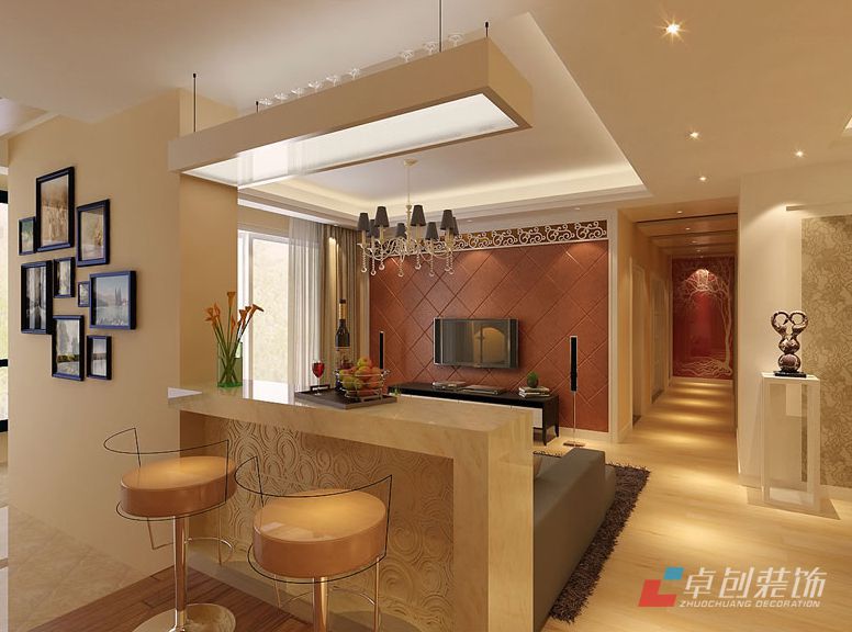客廳吧臺(tái)效果圖:吧臺(tái)設(shè)計(jì)很好的將客廳與餐廳做了一個(gè)簡(jiǎn)單的隔斷,而且看起來(lái)也很舒服,在工作閑暇之際還可以和自己的愛(ài)人,坐在吧臺(tái)上,品嘗一下美酒的滋味,宜心又宜情!