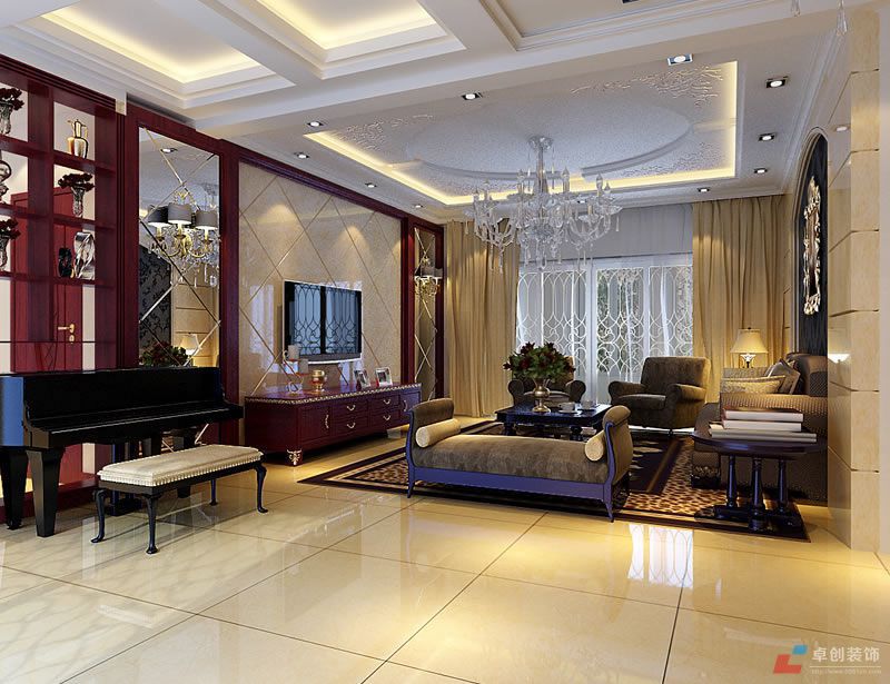 客廳家具顏色較深沉,端莊典雅,客廳中鋼琴的擺放顯示了主人深厚的文化底蘊(yùn)。