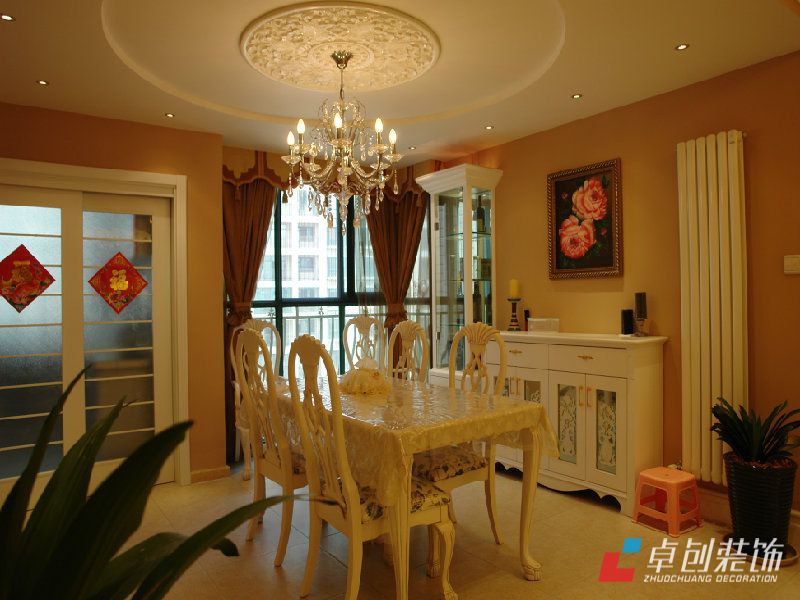 餐廳效果圖:餐廳的吊頂選擇的圓形吊頂,簡(jiǎn)歐風(fēng)格的墻面顏色不宜用冷色調(diào)的。