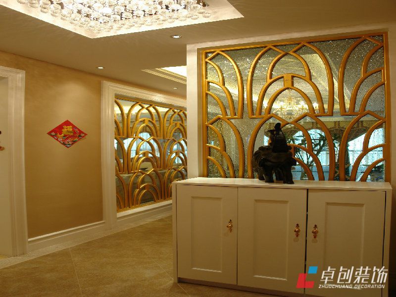 玄關(guān)效果圖: 玄關(guān)的設(shè)計(jì),用金色花格與磨砂玻璃相結(jié)合,過道采光更好。
